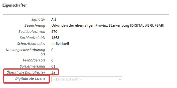 Sollte die Digitalisat-Lizenz sich je nach Bestand in Ihrem Archiv unterscheiden, können Sie den allgemeinen Wert vom Archiv hier für den Bestand überschreiben.