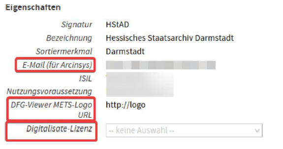 Bei den Einstellungen für das Archiv geben Sie in den Eigenschaften die E-Mailadresse, die Digitalisat- Lizenz und die URL für das METS-Logo ein: